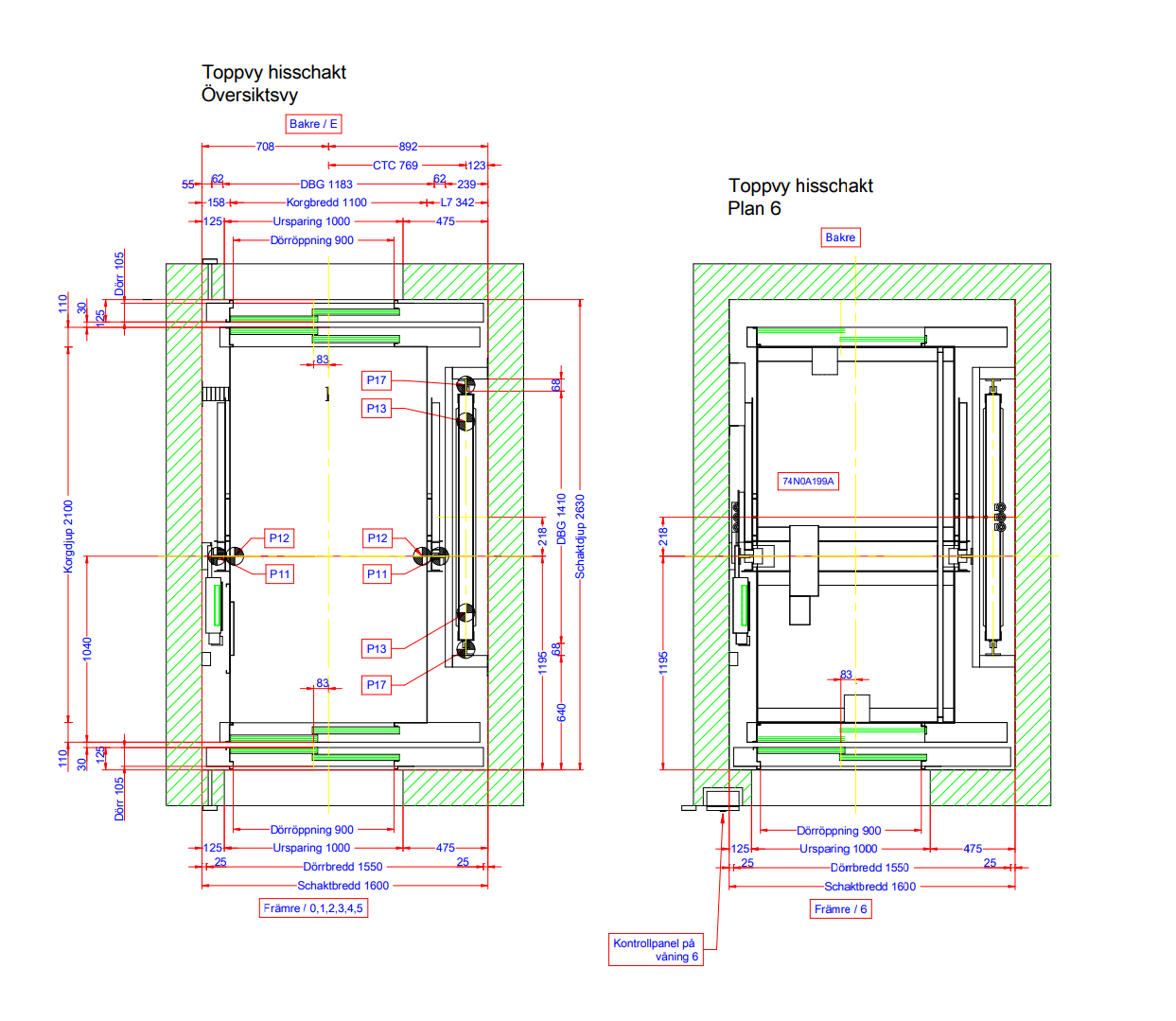 Hissmått Nedan bild visar måtten på hissen i huset. Viktiga mått: Dörröppning 900 mm Korgbredd 1100 mm Korgdjup 2100 mm